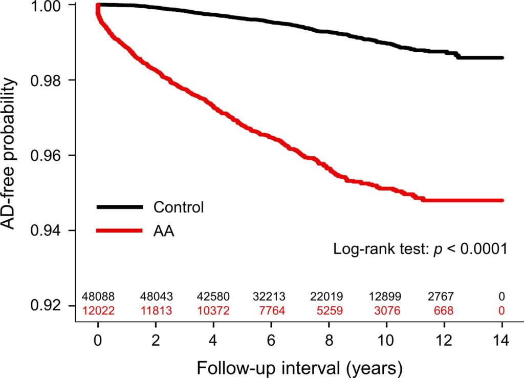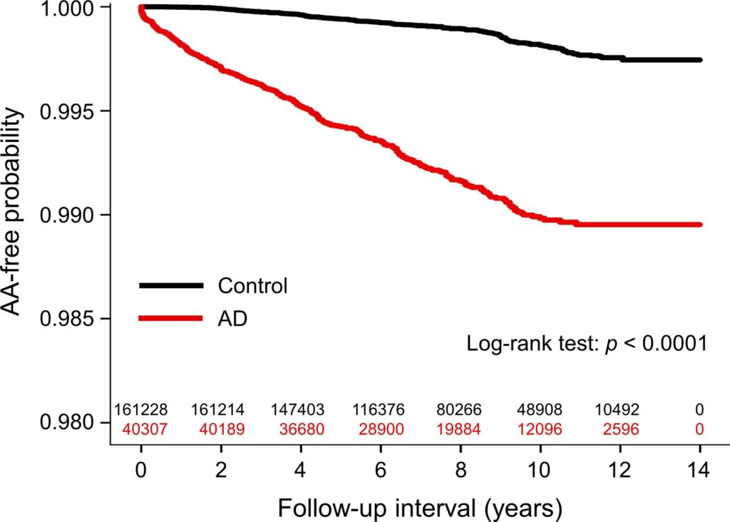 ■ 同様に、AD患者はAAを発症するリスクが有意に高かった(aHR:6.00; 95%CI 5.04-7.14)。