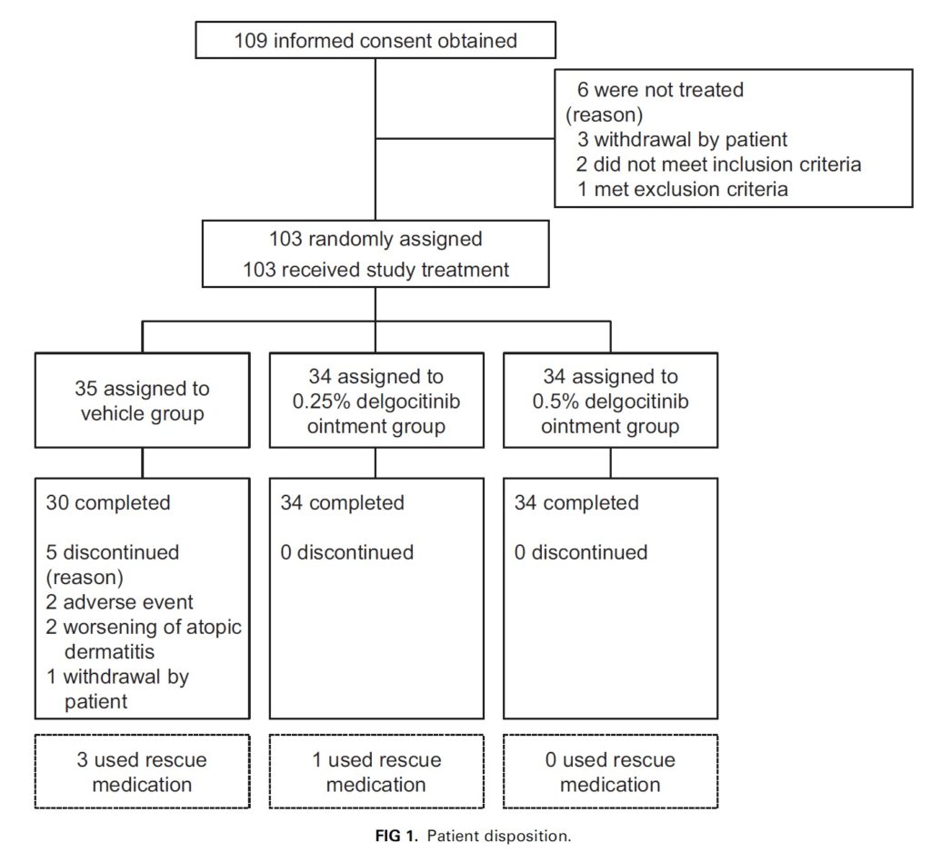 2~15歳の日本人アトピー性皮膚炎患者103人を、0.25%または0.5%のデルゴシチニブ軟膏群もしくは基剤軟膏群に1日2回4週間投与にランダム化し、有効性と有害事象を比較した。