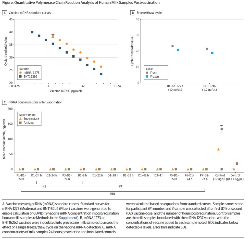 Golan Y, et al. Evaluation of Messenger RNA From COVID-19 BTN162b2 and mRNA-1273 Vaccines in Human Milk. JAMA Pediatrics 2021.