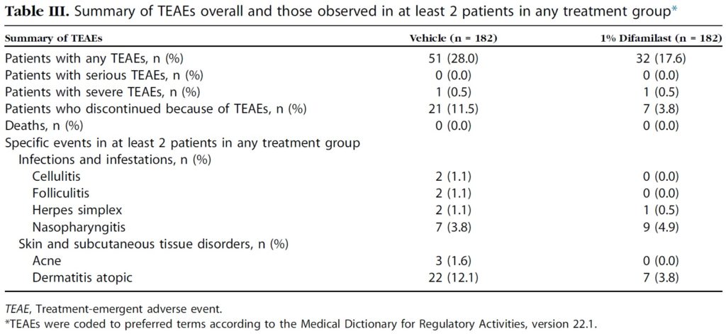 Saeki H, Ito K, Yokota D, Tsubouchi H. Difamilast ointment in adult patients with atopic dermatitis: A phase 3 randomized, double-blind, vehicle-controlled trial. Journal of the American Academy of Dermatology 2022; 86:607-14.