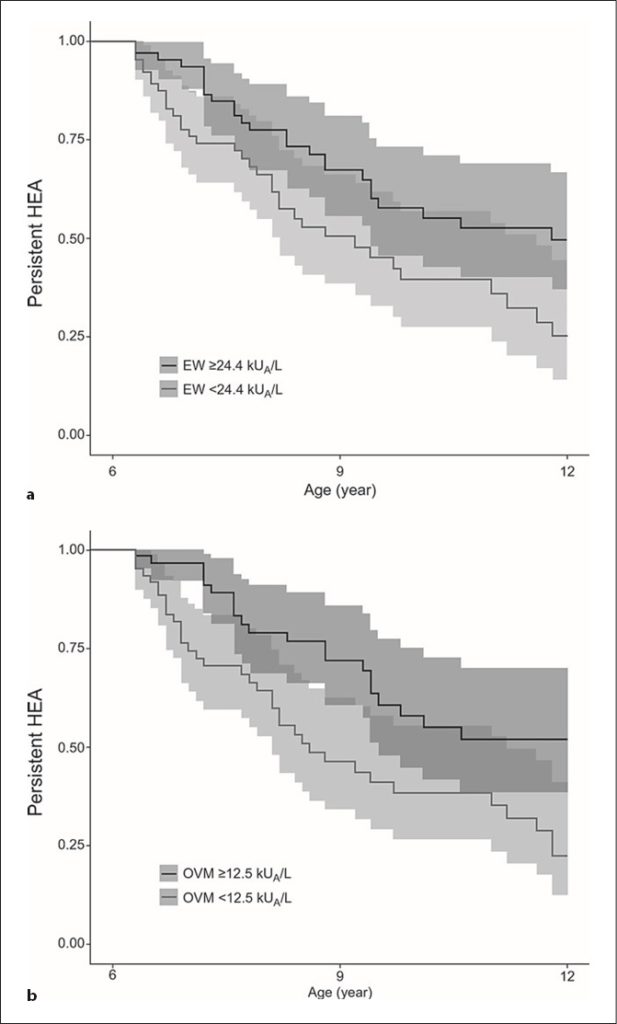 ■ 6歳以前にHEのアナフィラキシー歴があること、6歳までに少量の加熱HEにアレルギー反応があること、同年齢でのオボムコイド特異的IgE抗体価が高いことは、HEAの持続と関連していた。