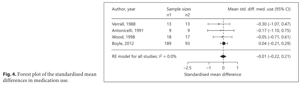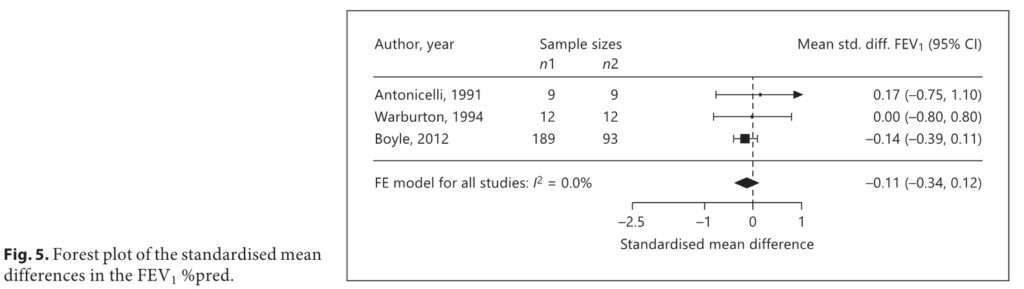 ■ 他のすべてのアウトカムにおける標準化平均差は有意ではなかった(ASS –0.68, p = 0.20; 投薬: –0.01, p = 0.94; FEV1 %pred –0.11, p = 0.34; PC20 +0.24, p = 0.53).。