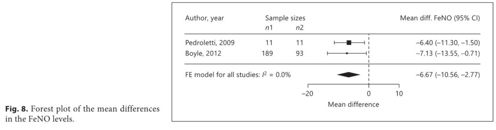 ■ AQLQスコアの平均差は+0.36(95%CI 0.10~0.62, p = 0.01, n = 302, I2 = 0%)、FeNO値は-6.67ppb(95%CI -10.56~-2.77, p = 0.0008, n = 304, I2 = 0%)と評価された。