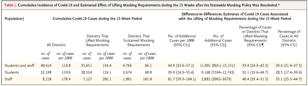 Cowger TL, Murray EJ, Clarke J, et al. Lifting Universal Masking in Schools — Covid-19 Incidence among Students and Staff. New England Journal of Medicine. 2022.