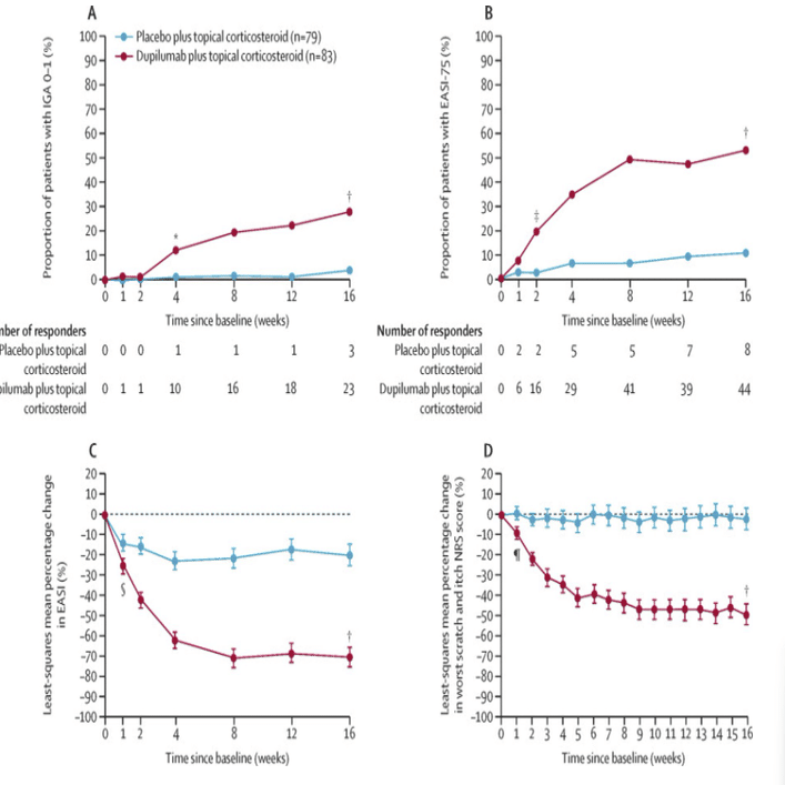 ■ 16週目において、デュピルマブ群ではプラセボ群より有意に多くの患者がIGA 0-1およびEASI-75を達成した。