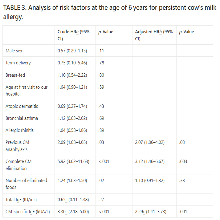 ■ ベースライン時のCMAの持続は、CM-sIgE値の高値(ハザード比2.29、95%信頼区間1.41-3.73、至適カットオフ値12.7 kUA/L)、CMアナフィラキシーの既往(2.07、1.06-4.02)、CMの完全除去(3.12、1.46-6.67)と関連していた。