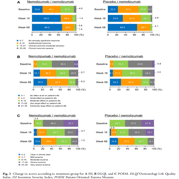 ■ ネモリズマブの皮下投与は、そう痒および皮膚症状を改善し、それにより睡眠、対人関係、社会活動や仕事活動能力を含む複数のPRO指標において患者のQOLを改善した。