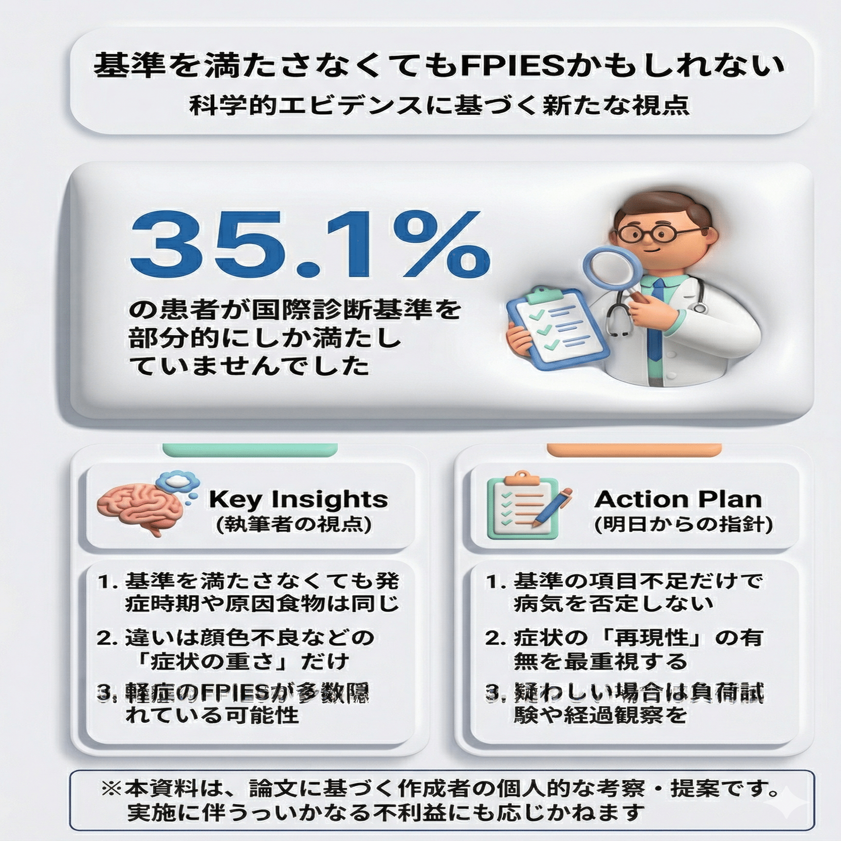 本研究は、FPIESの国際診断基準が実際の臨床現場でどこまで機能するかを検証した、日本発の貴重な大規模データです。225例という数は日本からの報告としては最大級であり、基準を部分的にしか満たさない79例(全体の約3分の1)の存在は、現行基準の「網の目」の粗さを浮き彫りにするものです。